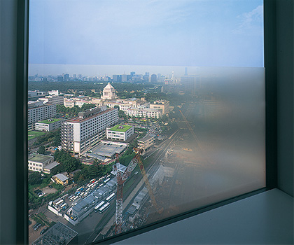 見る角度に応じて透明に見えたり、すりガラス状に見えたりする機能を持っているので、オフィスビルやマンション、住宅街における「プライバシーの保護」と「眺望の確保」といった、相反する問題を一挙に解決することも可能です。